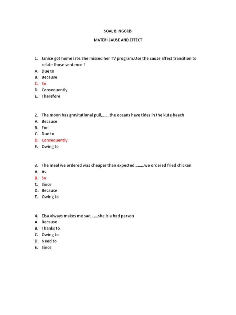 Soal Pilihan Ganda Cause And Effect : Learn English Online On Twitter Recount Text Exercise 3 Leotypesoftext Recounttext / Berikut soal cause and effect dan jawabannya.. Jan 11, 2020 · contoh soal song 7 : Jika kemampuan bahasa inggris bagus menjawab soal jenis teks pun akan mudah. Pada postingan ini kita akan melihat sejauh mana pemahaman kita tentang penggunaan, fungsi cause and effect. I have a dream, a song to sing to help me cope, with anything if you see the wonder, of a fairy tale you can take the future, even if you fail. Soal berikut terdiri dari 20 soal pilihan ganda berserta kunci jawabannya.